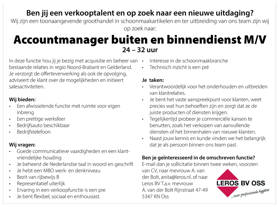• Ervaring in een verkoopfunctie is een pre